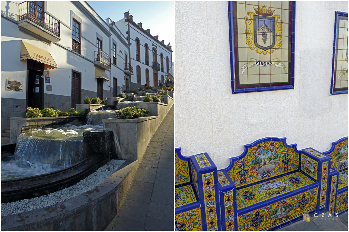Po krótkim plażowaniu zawracamy w głąb lądu i udajemy się do miejscowości Firgas. Ze względu na usytuowanie i widoki nazywana jest ona Balkonem Atlantyku. Nas poza widokami przyciągnęła tam uliczka prowadząca do głównego placu San Roque. Zbudowano na niej fontannę, która jest prawie 30 metrową kaskadą 🙂 . Wzdłuż kaskady zabudowane są ławeczki wyłożone ceramiką oraz ceramiczne herby miast. Po dojściu do San Roque uliczka nadal pnie się w górę – tym razem jednak miejsce wodnej kaskady zajmują “portrety” Wysp Kanaryjskich 🙂 . Na każdym z nich znajduje się herb oraz charakterystyczny widok z danej wyspy – wszystko oczywiście z ceramiki – oraz trójwymiarowa makieta wyspy. Jest to wszystko może odrobinkę kiczowate, ale i tak może się podobać 🙂 . Z samego placu San Roque, gdzie znajduje się kościół oraz ratusz, roztaczają się wspaniałe widoki na północne wybrzeże wyspy.